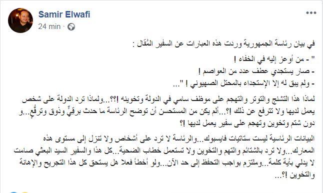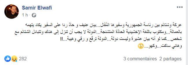 زووم- اِستهجن سمير الوافي اليوم في تدوينة له على صفحته الشخصيّة على الفايسبوك بيان رئاسة الجمهوريّة الذي جاء ردا على تصريحات السفير الدائم لدى الأمم المتّحدة المُقال المنصف البعتي.