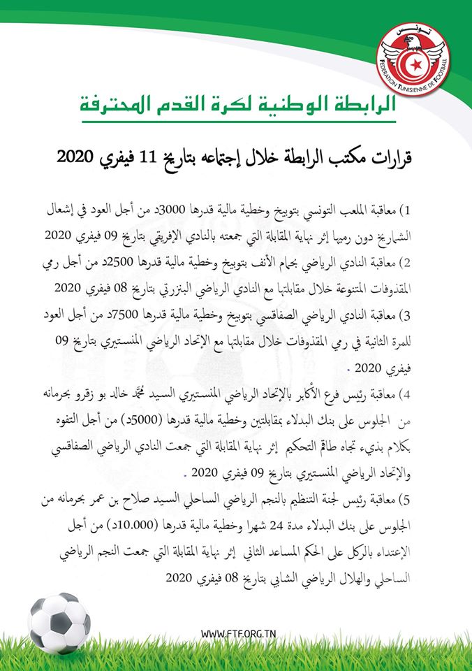 أعلن مكتب الرابطة خلال إجتماعه يوم 11 فيفري 2020 عن آخر القرارات.