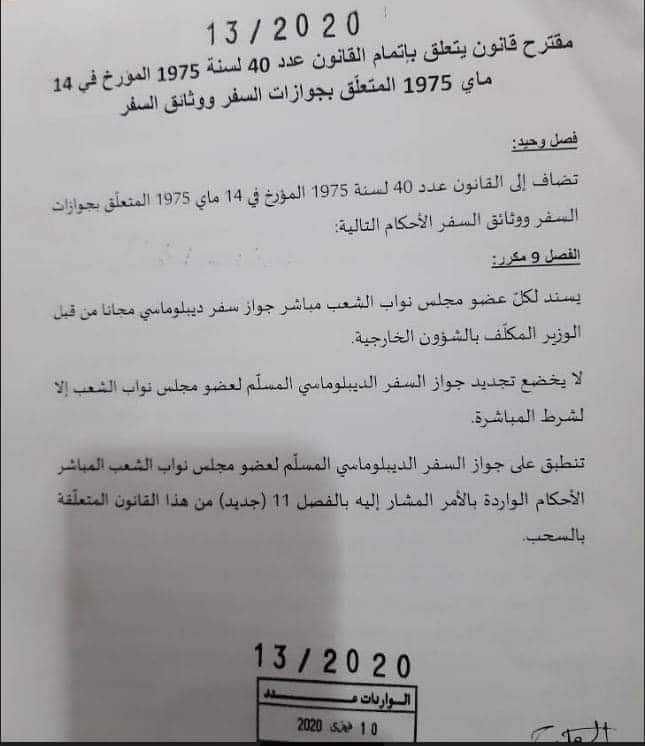 صادقت لجنة الحقوق والحريات والعلاقات الخارجية، اليوم الخميس 20 فيفري 2020، على مقترح مشروع القانون المتعلق بمنح النواب جوازات سفر دبلوماسية مجانا من قبل الوزير المكلف بالشؤون الخارجية.