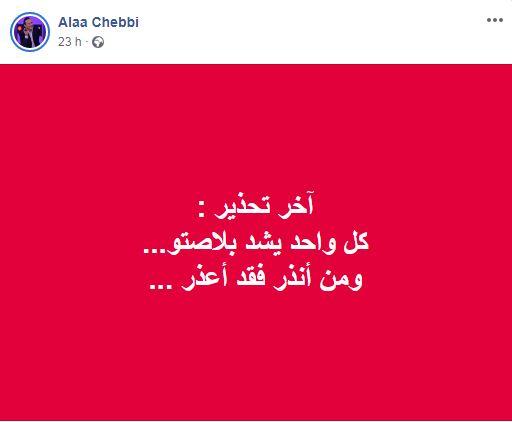 في المقابل نشر علاء الشابي أمس أيضا على صفحته على فايسبوك "آخر تحذير كل واحد يشدّ بلاصتو".