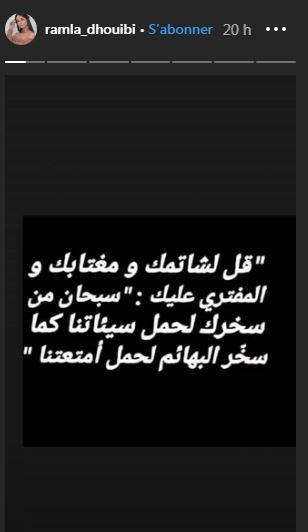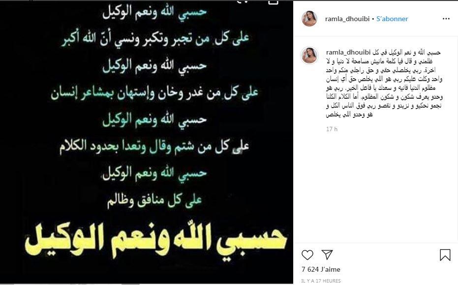 بعد هذه التدوينة بساعة نشرت رملة ذويب زوجة علاء الشابي على حسابها على انستغرام "حسبي الله و نعم الوكيل في كل من ظلمني و قال فيا كلمة مانيش مسامحة لا دنيا و لا اخرة، ربي يخلصلي حقي و حق راجلي منكم واحد واحد ".