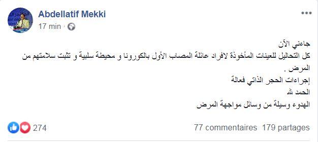 وقال المكّي "كل التحاليل للعينات المأخوذة لأفراد عائلة المصاب الأول بالكورونا و محيطة سلبية و تثبت سلامتهم من المرض" .