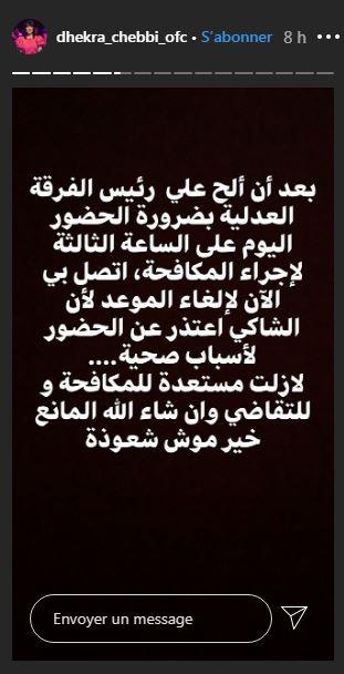 وكتبت الشابي "الشاكي اِعتذر عن الحضور لأسباب صحيّة.