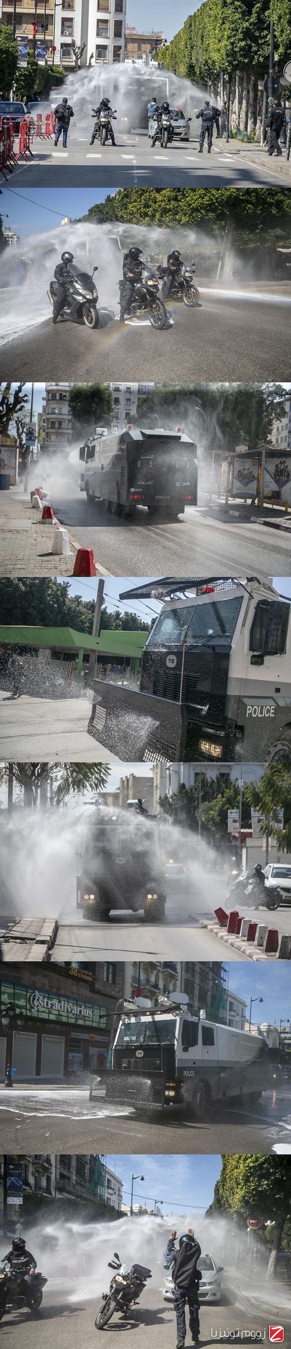 وقال آمر الفوج الوطني للمدرعات العقيد سفيان المرزوقي، في تصريحات إعلامية، إن "فرق الأمنيين قامت بإدخال تعديلات على المدرعات (المخصصة لتفريق المحتجين بالماء) وإضافة مواد تعقيم عليها لاستعمالها في التطهير".