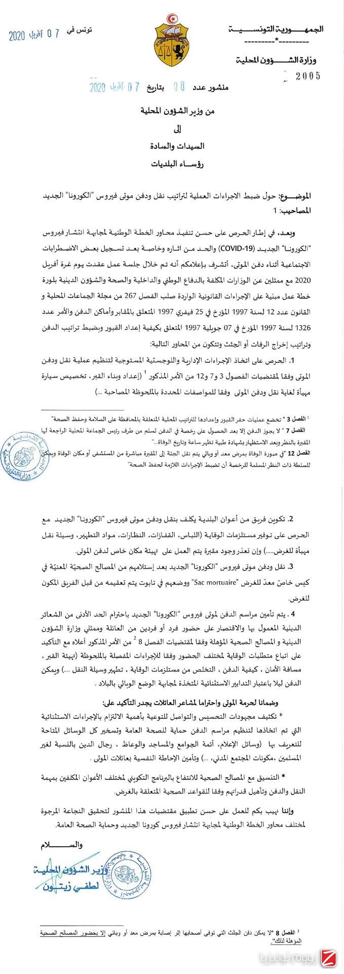 زووم - أصدر وزير الشؤون المحلية لطفي زيتون اليوم الثلاثاء 07 أفريل 2020، منشورا يضبط الإجراءات العملية لتراتيب نقل ودفن موتى فيروس كورونا المستجد.