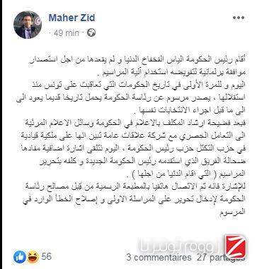 وكان النائب ماهر زيد قد نشر هذا الخطأ وسخر من رئيس الحكومة الذي "أقام الدنيا و لم يقعدها من اجل استصدار موافقة برلمانية لتفويضه استخدام آلية المراسيم ..يصدر مرسوم عن رئاسة الحكومة يحمل تاريخا قديما يعود الى ما قبل اجراء الانتخابات نفسها".
