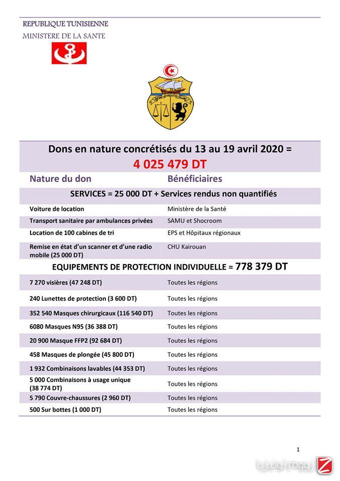أفادت لجنة الهبات والتبرعات بوزارة الصحة اليوم الإثنين 20 أفريل 2020، أن قيمة التبرعات في الفترة الممتدة من 13 إلى 19 أفريل 2020 بلغت، 4025479 مليون دينار.