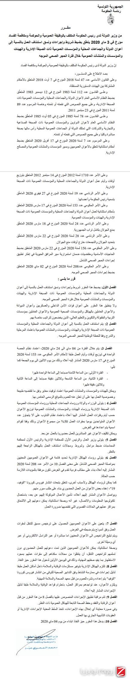 وينص الفصل الثاني من المقرر على أنّ يتم استئناف العمل بالنسبة إلى أعوان الدولة والجماعات المحلية والمؤسسات العمومية ذات الصبغة الإدارية والهيئات والمؤسسات والمنشآت العمومية باعتماد المرحلية والتدرج وفقا للخطة الوطنية للحجر الصحي الموجه .