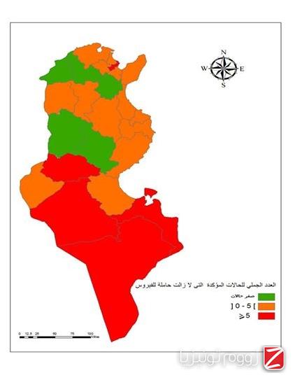 ووفق الرسم التالي فإن الولايات ذات الخطورة العالية لاِنتقال الفيروس هي تطاوين، قبلي، مدنين، قفصة وتونس.