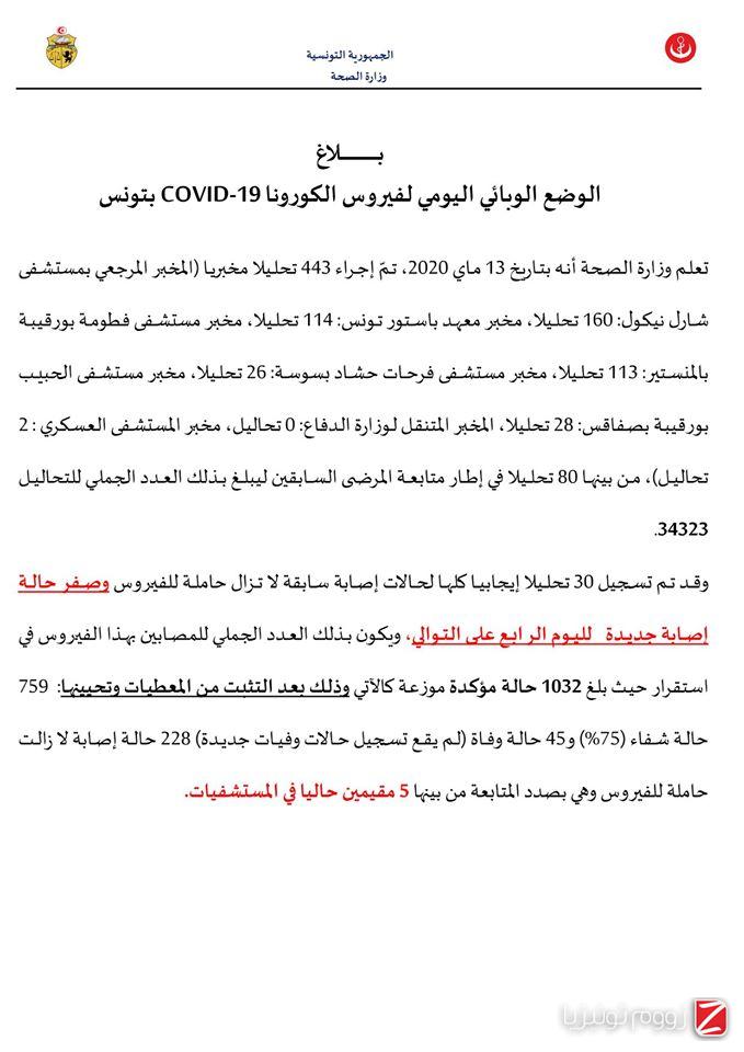 ووفق البلاغ نفسه فقد تمّ تسجيل 30 تحليلا إيجابيا كلها لحالات إصابة سابقة لا تزال حاملة للفيروس وصفر حالة إصابة جديدة لليوم الرابع على التوالي.