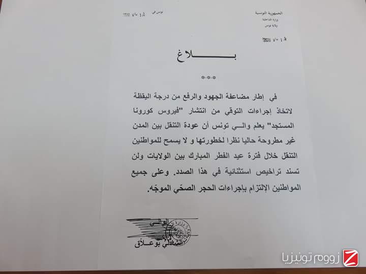 وأشاروالي تونس الشاذلي بوعلاق، إلى أنه لن يسمح للمواطنين التنقل خلال فترة عيد الفطر المبارك بين الولايات، ولن تسند تراخيص استثنائية لهذا الغرض.