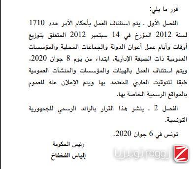 وسيكون ذلك بدايةً من يوم 8 جوان 2020، ويتم استئناف العمل بالهيئات والمؤسسات والمنشآت العمومية طبقا للتوقيت العادي المعتمد بها ويتم الإعلان عنه للعموم بالمواقع الرسمية الخاصة بها.
