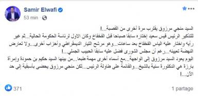 وذكّر سمير الوافي بأنّ الرئيس قيس سعيد كان قد اِختار مرزوق" سابقا صباحا قبل الفخفاخ وكان الاول لرئاسة الحكومة الحالية...ثم غير رأيه واختار عليه الياس الفخفاخ بعد ساعات...وهو مرشح التيار الديمقراطي وأحزاب أخرى...ولا تعارض النهضة تعيينه.."