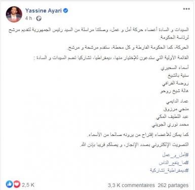 زووم- نشر النائب ياسين العياري، اليوم الجمعة 17 جويلية 2020، تدوينة على صفحته الرسمية بالفيسبوك، يبيّن فيها قائمة الأسماء التي سيصوّت عليها أعضاء حركة أمل وعمل لتقديم مرشح لرئاسة الحكومة بعد تسلّمهم مراسلة من رئيس الجمهورية في الخصوص.