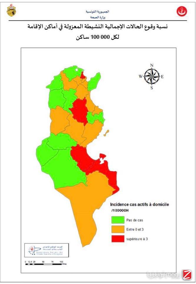 *ولايات ذات خطورة عالية لإنتقال الفيروس : المناطق الحمراء التي تتمير بنسبة وقوع الحالات النشيطة بمعدّل يفوق 10 / 100000 ساكن.