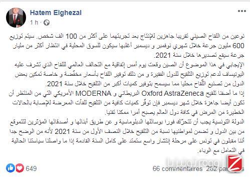 زووم - نشر الدكتور حاتم الغزال المختص في علم الأجنة، مساء السبت تدوينة على حسابه الشخصي بالفايسبوك، أكّد فيها نجاح الصين في تجربة اكثر من لقاح على 100 الف شخص بنجاح.