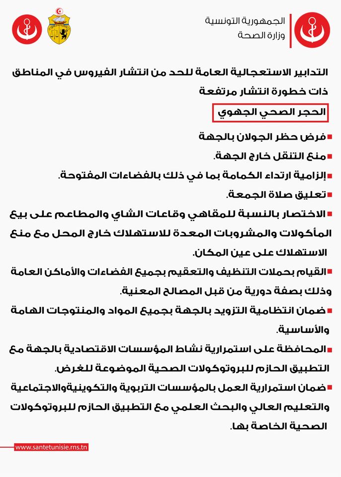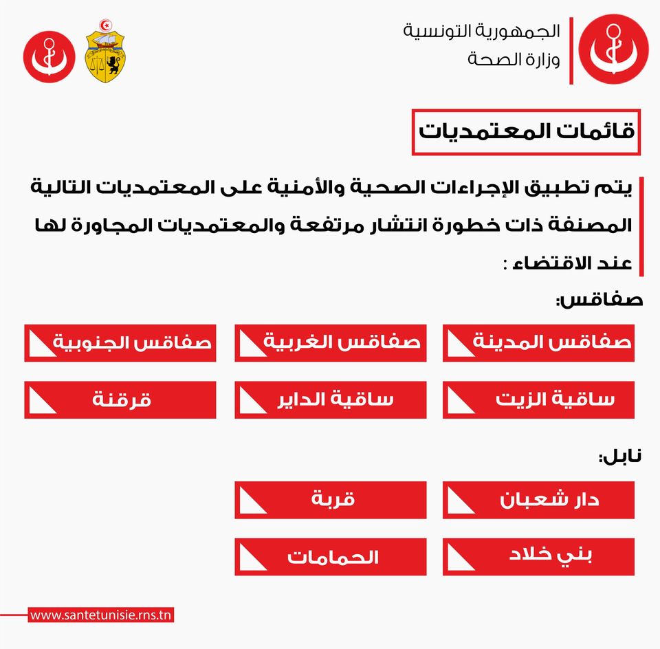 وقد تمّ إحالة هذه القائمة إلى السلطات الجهويّة المعنيّة قصد تطبيق الإجراءات الصحيّة والأمنيّة التي تمّ إقرارها في مجلس الوزراء المضيّق المنعقد يوم 3 أكتوبر 2020.