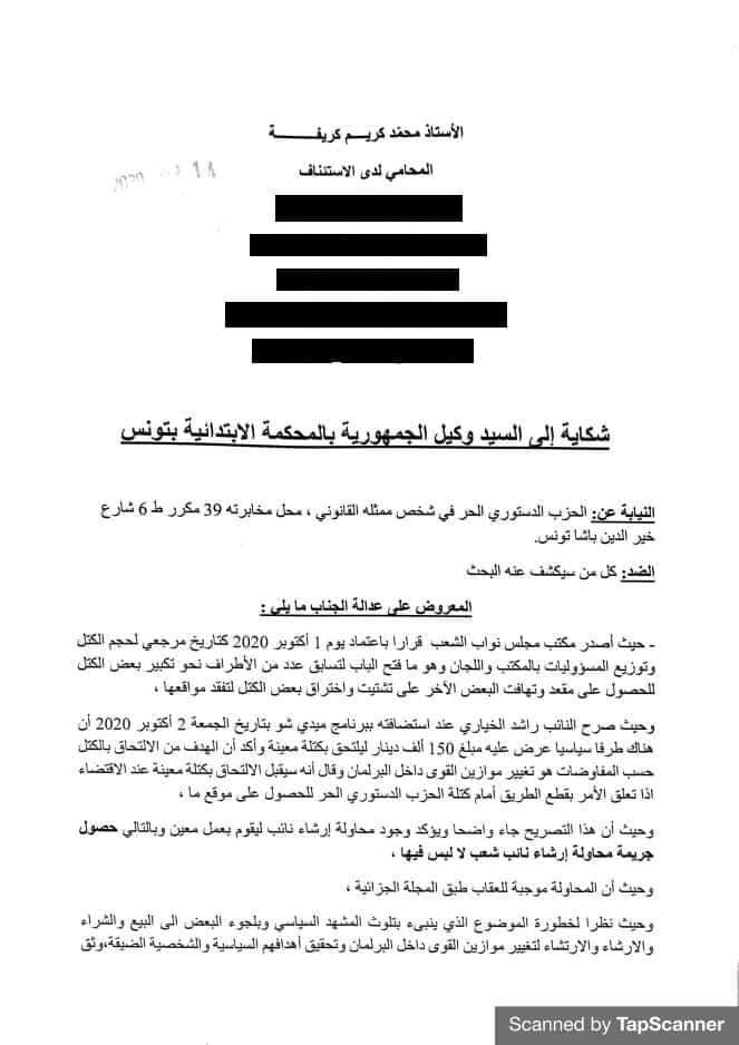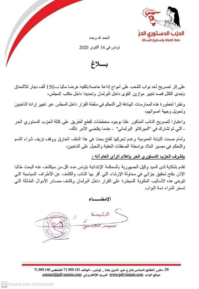 أعلن الحزب الحر الدستوري، اليوم الأربعاء 14 أكتوبر 2020، أنّه أودع شكاية لدى وكيل الجمهورية بالمحكمة الإبتدائية بتونس ضد كل من سيكشف عنه البحث طالبا الإذن بفتح تحقيق في محاولة إرشاء نائب.