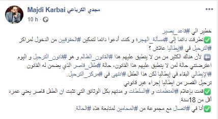 وأضاف مجدي الكرباعي أنّ القانون الإيطالي يضمن البقاء للاطفال القصر على أراضيها إلا أنّ الطفل المذكور تمّ احتجازه ليتم ترحليله.
