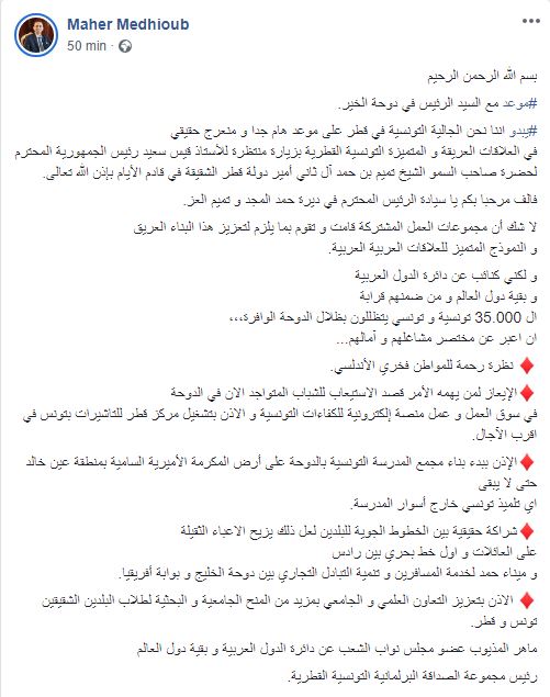 وأكّد ماهر المذيوب، في تدوينة على صفحته الخاصة بالفايسبوك، أنّ "الجالية التونسية في قطر على موعد هام جدا و منعرج حقيقي".