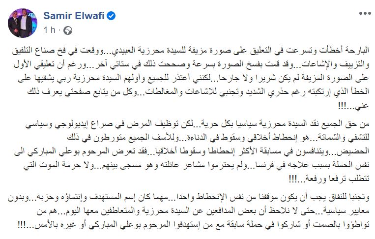 وقال الوافي، في تدوينة على صفحته الخاصة بالفايسبوك، "وقعت في فخ صناع التلفيق والتزييف والإشاعات...وقد قمت بفسخ الصورة بسرعة وصححت ذلك في ستاتي آخر...ورغم أن تعليقي الأول على الصورة المزيفة لم يكن شريرا ولا جارحا...لكنني أعتذر للجميع وأولهم السيدة محرزية ربي يشفيها على الخطأ الذي إرتكبته رغم حذري الشديد وتجنبي للاشاعات والمغالطات...وكل من يتابع صفحتي يعرف ذلك عني".