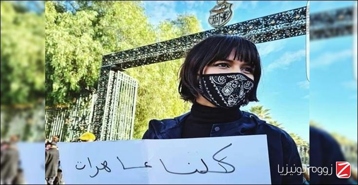 زووم - رفعت الممثلة والعارضة التونسية عزة سليمان، اليوم الثلاثاء، لافتة أمام مجلس نوّاب الشعب قالت فيها "كلنا عاهرات حتى تسقط السلطة الابوية !! الحكومة !!! ".