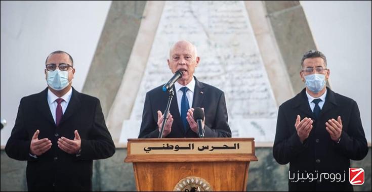 وأبّن الرئيس قيس سعيد الشهداء الثلاثة الوكيل سيف التليلي، والعريف أول حسام وناس، والعريف أول أشرف الرواحي، وتلا رفقة رئيس الحكومة، وكل الحضور، فاتحة الكتاب ترحما على أرواح الشهداء.