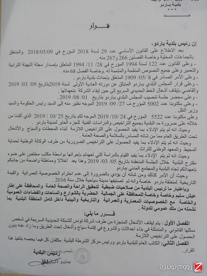 زووم - أصدر رئيس بلدية باردو مساء اليوم الجمعة 08 نوفمبر 2019، قرارا يقضي بإيقاف أشغال منجزة من طرف شركة تونس للشبكة الحديدية السريعة.