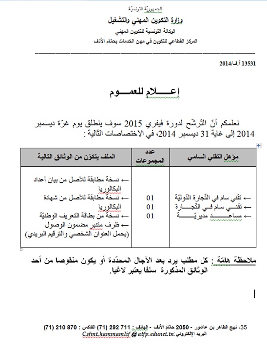 فتح باب الترشح للتكوين بالمركز القطاعي للتكوين في مهن الخدمات بحمّام الأنف