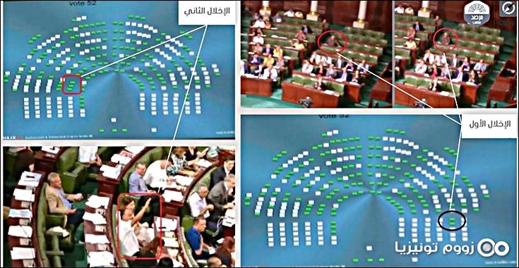 2- قام النائب كريم الهلالي عن كتلة آفاق تونس ونداء التونسيين بالخارج بالتصويت مرّتين: مرّة باستعمال البطاقة ومرّة برفع الأيدي.