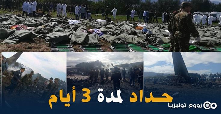 وسيتواصل الحداد لمدة 3 أيام انطلاقا من اليوم الأربعاء وذلك بعد تحطم الطائرة العسكرية قرب مطار بوفاريك الجزائري.