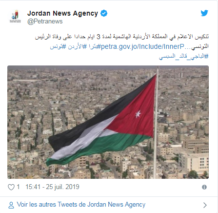 أفادت وكالة الأنباء الأردنية في تغريدة على تويتر أنّه سيتمّ تنكيس الأعلام في المملكة الأردنية الهاشمية لمدة 3 أيام حدادًا على وفاة الرئيس التونسي الباجي قايد السبسي.
