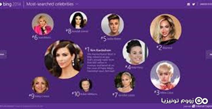 واحتلّت الممثلة وعارضة الأزياء الأمريكية “كيم كارادشيان” الترتيب الأول على قائمة الأشخاص الذين بحث عنهم مستخدمو الإنترنت في العام 2014، فيما جاءت المُغنية “بيونسيه” في الترتيب الثاني، واحتلّت المُغنّيتان “مايلي سايرس” و”كاتي بيري” الترتيبين الثالث والرابع، وجاء المُغني “جستن بيبر” في المركز الخامس. أما من حيث الأجهزة فقد جاء هاتف آبل “آيفون 6″ على رأس القائمة تبعه جهاز ألعاب مايكروسوفت “إكس بوكس وَن” والجهاز الرياضي “فِت بِت” ومن ثم “آيباد”، يليه حاسب مايكروسوفت اللوحي “سيرفس برو 3″ في المركز الخامس. وبالنسبة للتطبيقات، فقد كان تطبيق “فيسبوك” للهواتف الأكثر بحثًا عنه، تليه تطبيقات “تويتر” و “إنستاجرام” و “سكايب” وتطبيق مُشاركة الفيديو “فاين”. ومن المواضيع الإخبارية التي حازت على أعلى نسب البحث كان للرياضة نصيب كبير حيث جاء كأس العالم في الترتيب الأول تلاه المُباراة النهائية لدوري كرة القدم الأمريكي، ثم الطائرة الماليزية المفقودة والألعاب الأولمبية الشتوية، كما برز البحث عن الدولة الإسلامية في العراق والشام، ثم ظهور مرض “إيبولا”. يُذكر بأن مايكروسوفت توصّلت إلى هذه النتائج بعد تحليلها لملايين عمليات البحث في Bing عن الكلمات المفتاحية الخاصة بالمشاهير والمواضيع الإخبارية والتكنولوجيا وغير ذلك من المواضيع.