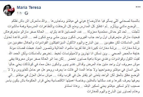 وأشارت التونسية في تدوينة لها على "الفايسبوك" أنّ المواد الغذائية مفقودة في العديد من المغازات الكبرى نظراً لكون المواطنين اِشتروا "مونة" خوفاً من الحجز الصحي، مُؤكّدة أنّ الوضع مُقلق فعلاً وأنّ اتخاذ قرار العزل في مدينة ميلانو ليس بالأمر السهل بإعتبار كبر مساحتها وعدد سكانها وخاصة أهميتها الإقتصادية قائلة "يعني قرار الحكومة باش يكون ياسر صعيب لانو تسكير ميلانو يعني تسكير البلاد .. وهانا نستناو".