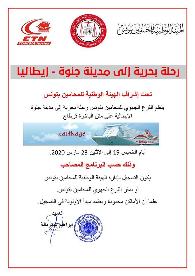 زووم- أعلنت الهيئة الوطنية للمحامين بتونس اليوم الإثنين 24 فيفري 2020، عن تنظيم رحلة بحريّة إلى مدينة جنوة الإيطالية على متن الباخرة قرطاج.