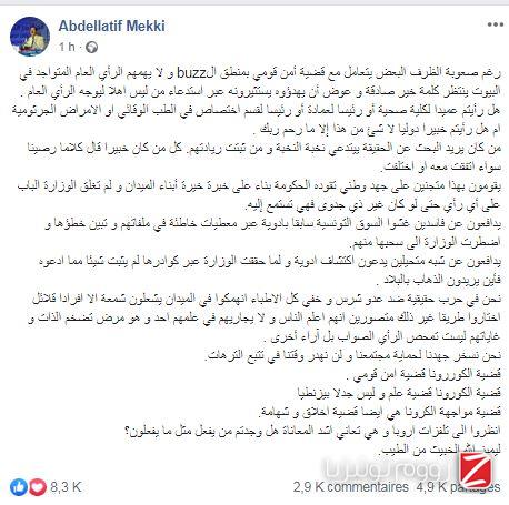 وقال المكي ، في تدوينة له على "الفايسبوك"، أنّه "رغم صعوبة الظرف البعض يتعامل مع قضية أمن قومي بمنطق الbuzz و لا يهمهم الرأي العام المتواجد في البيوت ينتظر كلمة خير صادقة و عوض أن يهدؤوه يستثيرونه عبر استدعاء من ليس اهلا ليوجه الرأي العام".