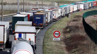 تصطف طوابير طويلة من الشاحنات على الحدود بين مدينة كالي شمال فرنسا، وبريطانيا منذ إغلاق جميع المنافذ البحرية والبرية ...