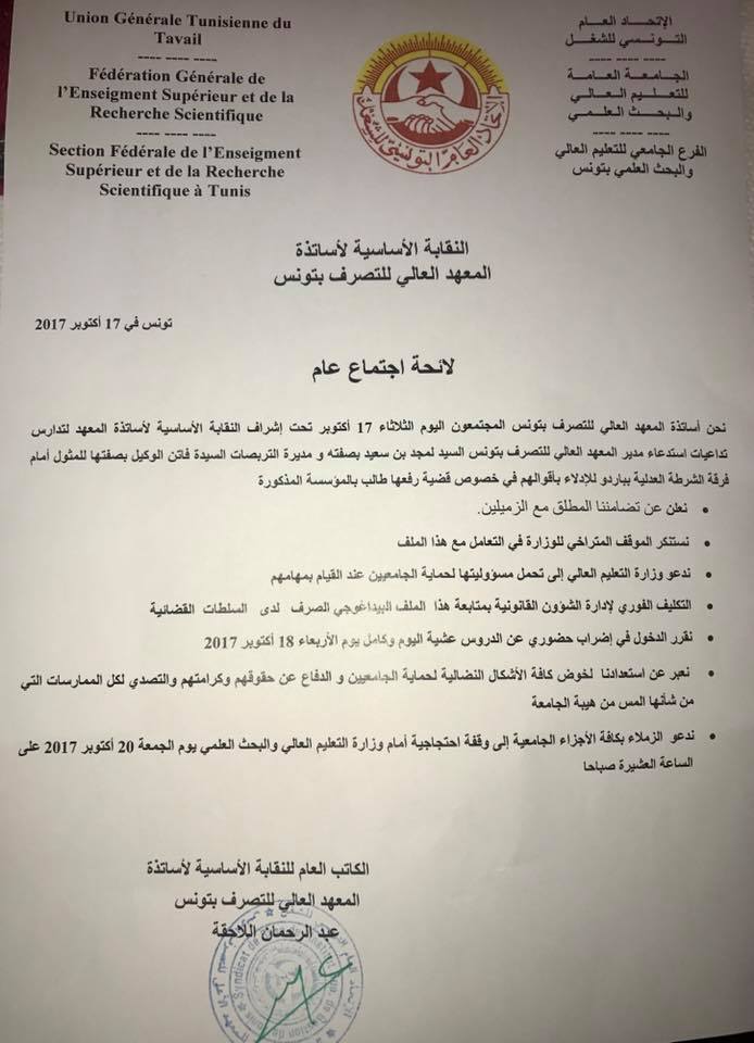 ويأتي ذلك بعد استدعاء مدير المعهد لمجد بن سعيد ومديرة التربصات فاتن الوكيل للمثول أمام فرقة الشرطة العدلية بباردو للإدلاء بأقوالهم في خصوص قضية رفعها طالب بالمؤسسة.