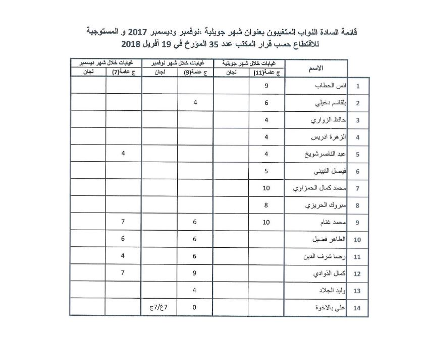 أعلن مجلس نواب الشعب، اليوم الجمعة، عن أسماء النواب المتغيبين بعنوان أشهر جويلية ونوفمبر وديسمبر 2017 والمستوجبة لاِقتطاع الجرايات حسب قرار المكتب عدد 35 المؤرخ في 19 أفريل 2018.