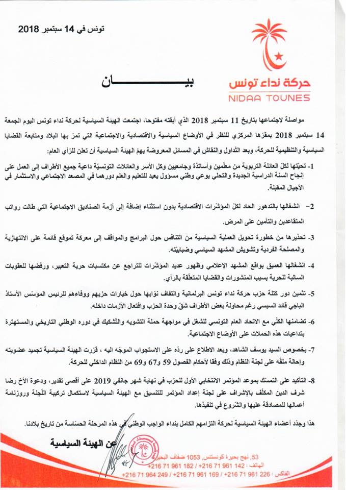 هذا وقررت حركة نداء تونس تجميد عضوية رئيس الحكومة يوسف الشاهد وإحالة ملفّه على لجنة النظام.
