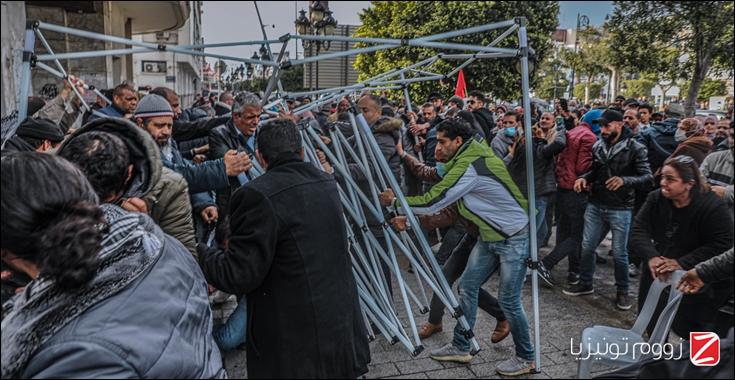 وتابعت "وباستشارة النيابة العمومية، أذنت بحجز المعدات المذكورة من خيام وكراسي وعصيّ تُستعمل لتركيز الخيام كما أذنت بإخلاء الطريق العام مع تقديم كل طرف ضالع في عملية الاعتداء على الأمنيين وتعهيد فرقة مختصة من الحرس الوطني لمواصلة البحث الذي شمل حاليا 10 أشخاص هذا ولا يزال البحث جار لتقديم بقية الأطراف الضالعة في الموضوع وإتمام كل ما يلزم من أبحاث ومراجعة النيابة العمومية، لتُقرّر ما تراه من إجراءات تحفّظية".