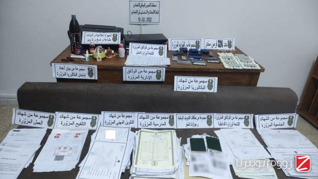 وبمزيد تعميق التّحرّيّات، تمّ التّعرّف على هويّة المورّطيْن في تدليس الشّهادتيْن المدرسيّتين، وبتفتيش منزل الامرأة المذكورة، بعد التّنسيق مع النّيابة العموميّة، تمّ القبض عليها وحجز شهادة مدرسيّة مفتعلة (خاصّة بابنتها)، وقد قالت إنّها تحصّلت على الوثيقة المدلّسة (التي تمّ حجزها) من قبل شخص (المورّط الرّئيسي في عمليّة التّدليس موضوع قضيّة الحال)، الذي بتفتيش منزله، تمّ حجز حاسوبين محمولين وآلة طباعة ومجموعة من الطّوابع والوثائق المفتعلة (وثائق إداريّة وشهائد علميّة وشهائد عمل ونسخ من بطاقات التّعريف الوطنيّة وجوازات السّفر وشهائد تلقيح وشهائد جامعيّة وشهائد باكالوريا وشهائد تكوين مهني)، كما تمّ حجز 324 قرصا مخدّرا.