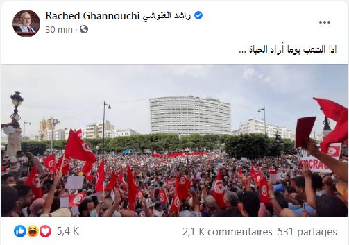 زووم - علّق رئيس البرلمان راشد الغنوشي، اليوم الأحد، على الوقفة الرافضة للتدابير الاستثنائيّة بالقول "اذا الشعب يوما أراد الحياة".