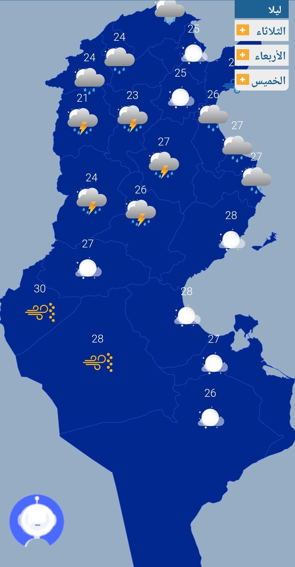 هذا وتتراوح الحرارة ليلا بين 24 و28 درجة، تكون في حدود 21 بالمرتفعات، وتصل الى 30 بالجنوب.