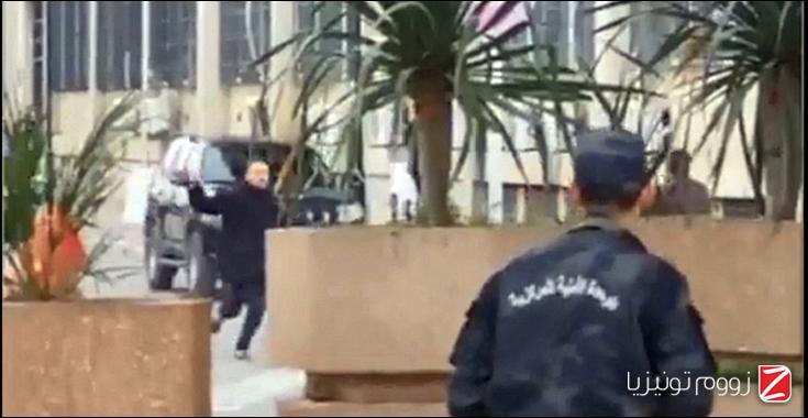 هذا ورغم محاولة التّصدّي له من قبل أعوان الأمن وتكرار دعوته للاستسلام وإلقاء ما بيديه واصل مواجهة كلّ من يقترب منه مشهرا "الشاقور" مردّدا "يا طاغوت الله أكبر يا كفّار"، مواصلا الجري يمينا ويسارا ثمّ باقترابه نحو مبنى الوزارة أشهر سلاحه مرّة أخرى، محاولا الاعتداء على عون أمن كان في مواجهته الأمر الذي اضطر العون المذكور إلى إطلاق النّار عليه فسقط أرضا وتمّت السّيطرة عليه وتجريده ممّا كان يحمله ونقله بواسطة سيّارة الحماية المدنيّة للمستشفى للعلاج، وفق نص البلاغ.