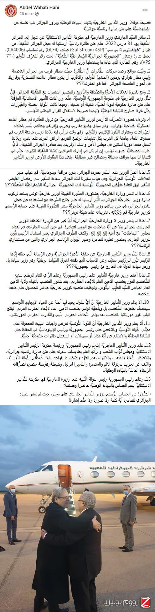 وأضاف الهاني، في تدوينة له على الفايسبوك، أنّ الجرندي سافر عن عجل إلى الجزائر الشَّقيقة يوم 31 مارس 2022، على متن طائرة رئاسيَّة أرسلتها له عجل الجزائر الشَّقيقة تحمل شارة وشعار "الجمهوريَّة الجزائريَّة الدِّيمقراطيَّة الشَّعبيَّة"، تحت رقم المُعرِّف الدُّولي (7T-VPS)، وهي الطَّائرة الَّتي عادة ما يستعملها وزير الخارجيَّة الجزائري.