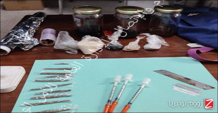 وقد عُثر على عدد 11 لفافة من مخدّر "الزّطلة" وكمية من مسحوق أبيض اللون يشتبه في كونه من مخدّر "الكوكايين"، كما تم حجز سائل مخدّر داخل قوارير يتعمد المعني تصنيعه بنفسه بالمنزل يقع حقنها مباشرة في العروق حسب تصريحات المظنون فيه.