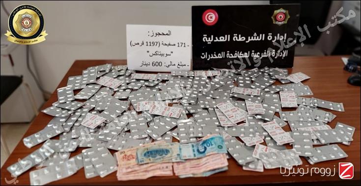 زووم - تمكّنت الوحدات الأمنية التابعة للإدارة الفرعية لمكافحة المخدّرات بإدارة الشرطة العدليّة إثر مداهمة أمنية قانونية على منزل أحد مروّجي المخدّرات بجهة الملاسين من حجز عدد 1197 قرص مخدّر نوع "سوبيتاكس" بقيمة 53 ألف دينار ومبلغ مالي قدره 600 دينار من عائدات الترويج.
