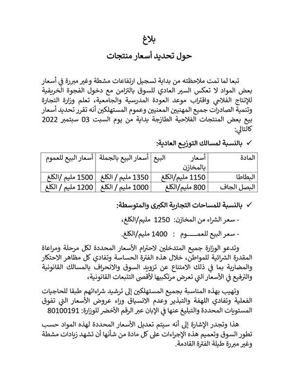 قررت وزارة التجارة تحديد أسعار بعض المنتجات و ذلك تبعا لما تمت ملاحظته من بداية تسجيل ارتفاعات مشطة وغير مبررة في أسعار بعض المواد لا تعكس السير العادي للسوق بالتزامن مع دخول الفجوة الخريفية للإنتاج الفلاحي واقتراب موعد العودة المدرسية والجامعية حسب بلاغ لها.