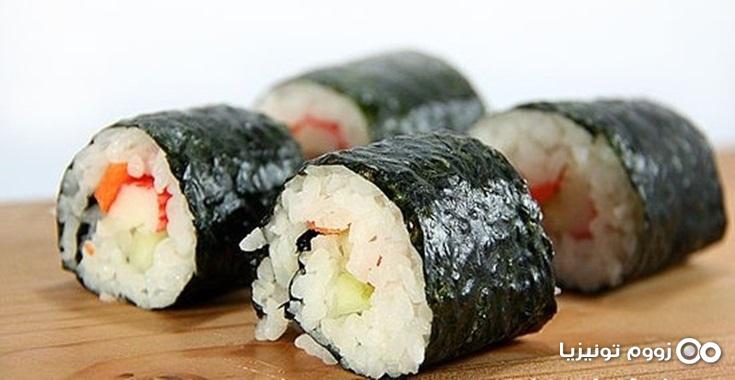 4- إفردي كل ورقة نوري على حدى، ضعي عليها الأرزّ بشكلٍ متساوٍ ثمّ خطّ رفيع من بيض السمك، السلمون والخيار بالطول.